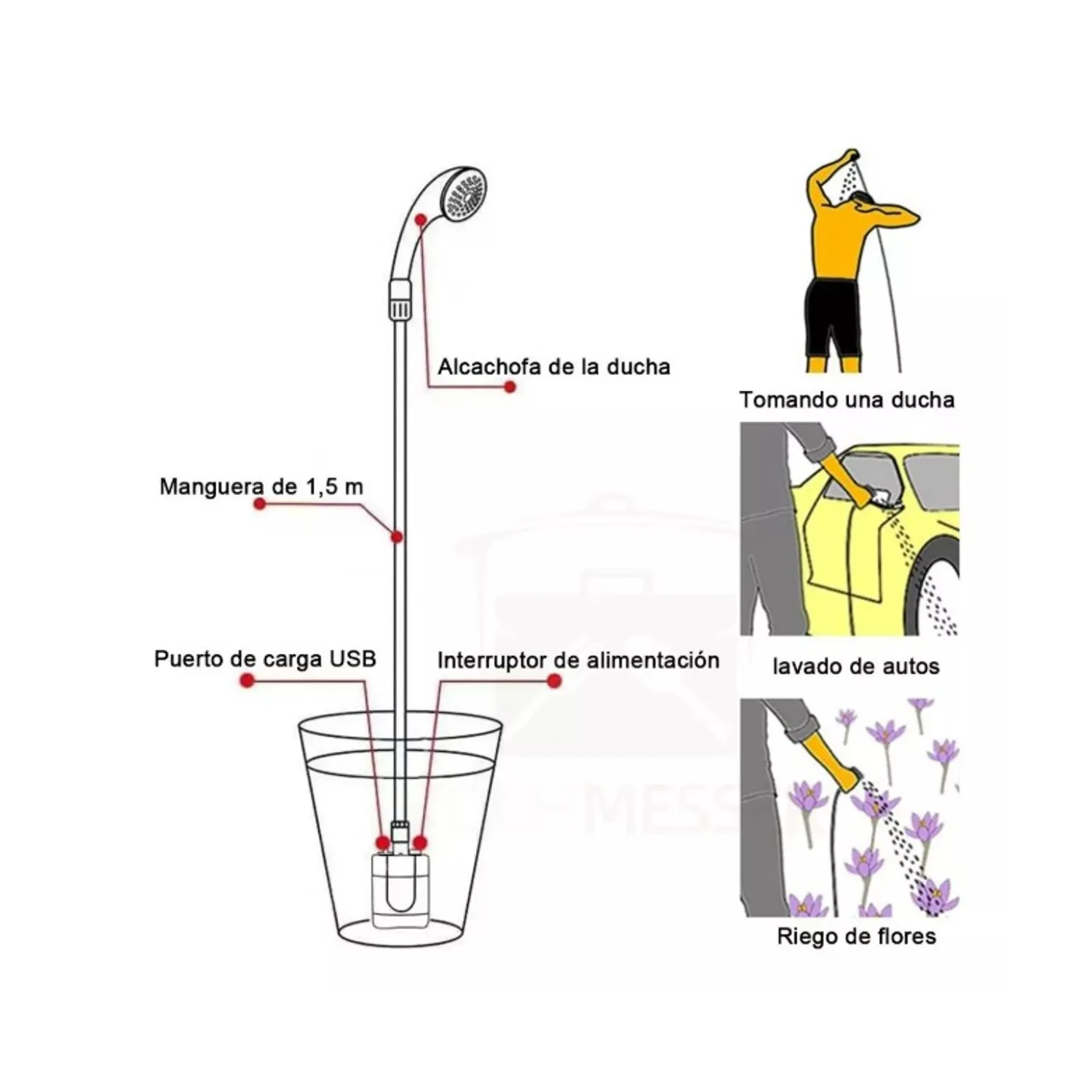 | 🚿 DUCHA DONDE QUIERAS | Es 100% inalámbrica y recargable. Te da una higiene completa en la playa, camping o senderismo, ¡sin instalaciones! |